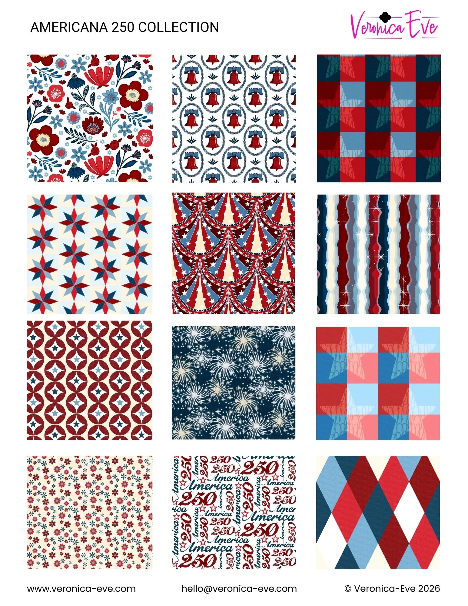 A collection of Americana designs inspired by the 250th Anniversary of the founding of America. This collection features designs with a 1950s flair in traditional colors of red, white, and blue. These designs will inspired your imagination for all you sewing or home decorating projects celebrating America!